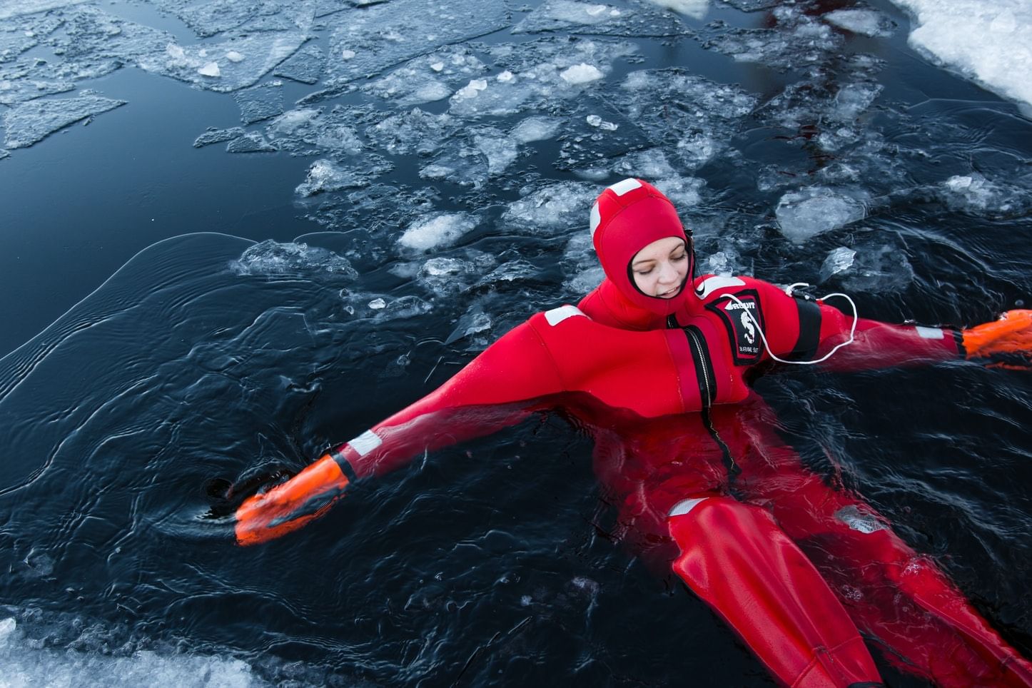 Come and experience the lightness of your body during the arctic ice floating! Don’t fear the cold as you are totally protected with high quality rescue suit. Let your body and mind float, enjoy this frozen adventure. This guided adventure is safe with a high-quality rescue suit that covers your whole body and keeps you dry. As you have your own clothing under the suit you will not get cold even in the open 0-degree water. Lying down in the frozen lake between the ice blocks is something worth trying, the circumstances truly are arctic!