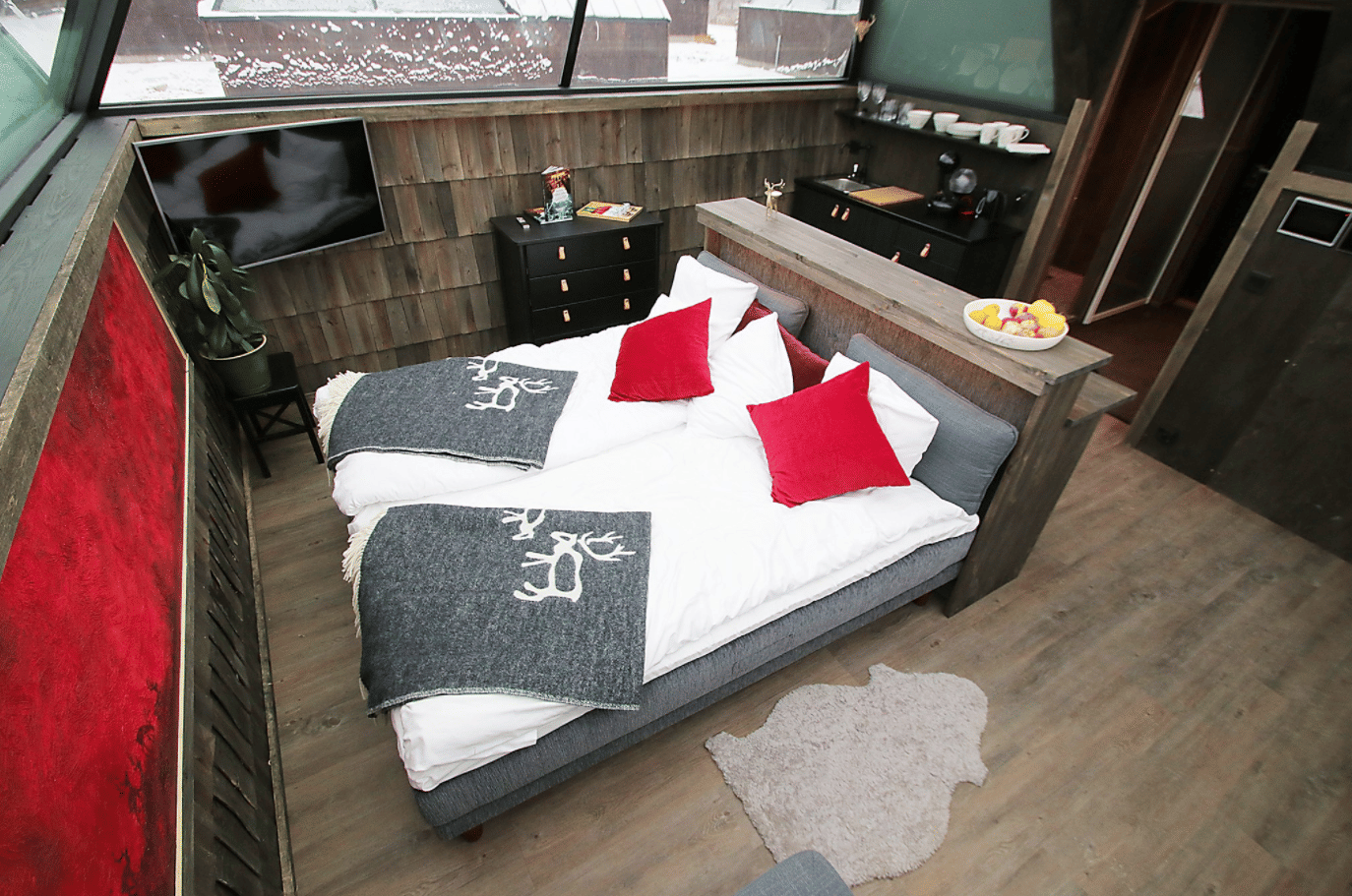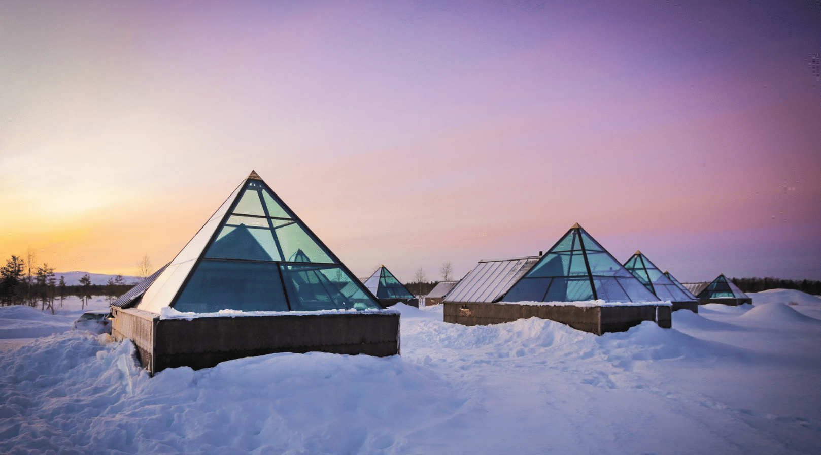 Aurora Pyramids is located in Köngäs and about a 20-minute drive to Levi Ski Resort. This resort offers you an escape in peaceful nature of Finnish Lapland. The resort features rooms and cabins that are ideal for watching the northern lights. The Aurora pyramids (11 of them) are situated at Tonttula Experience Villa, only 10 minutes drive away from Levi centre. Kittilä Airport is 21km away from Aurora Pyramids. Each pyramid (30 m2) has a bedroom with a panorama window and double bed, desktop and bar chairs, armchair, TV, small kitchenette, and WC/shower. Furthermore, the pyramids have a vestibule with room for clothes. The amenities of the room include a fridge, water kettle, capsule coffee maker, hairdryer, and sleep masks, which help to sleep during the nightless night.