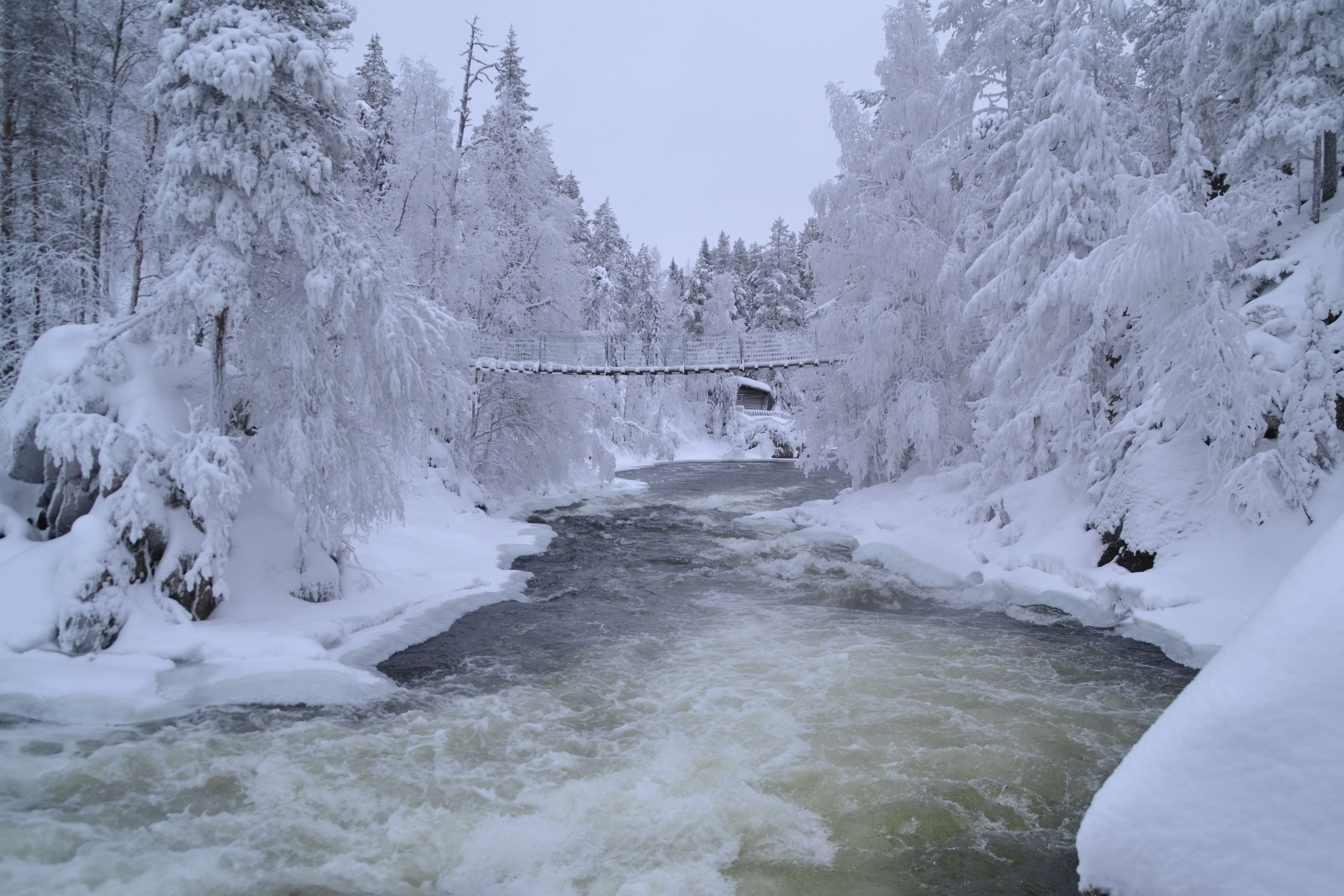 After meeting up with our guide we drive to Juuma village. Here is where our journey will start to Jyrävä water fall. This snowshoe hike takes us to the most beautiful part of Kuusamo and Oulanka national park, The little bears trail. We will hike next to the river Kitka with snowshoes and see the famous Myllykoski old mill next to the roaring waters. Next to the water we may see white throated dippers or otters having fun in the flowing water and snow. The white throated dipper is a famous among the locals, this bird stays in Oulanka over the winter and eats food from under the water. If you are lucky you can see it jumping into the stream and back up. This winter scenery will surely take your breath away. Hiking distance is about 4-5 kms and during the program we will have a coffee break with sandwiches.